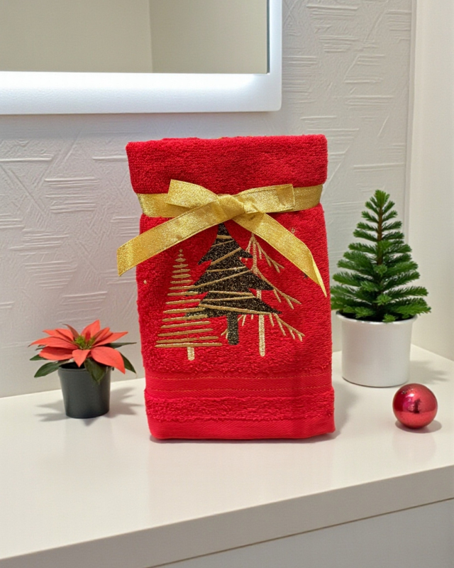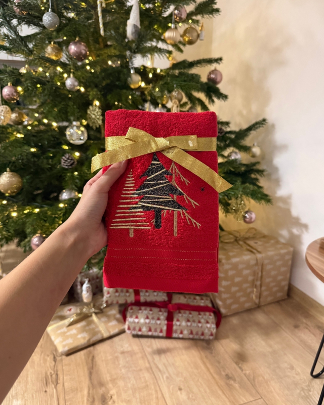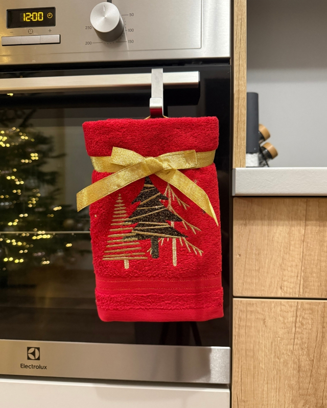 Predstavujeme vám najkrajší vianočný darček, ktorý spojí tradíciu s praktickosťou – náš červený vianočný uterák s výšivkou vianočných stromčekov.