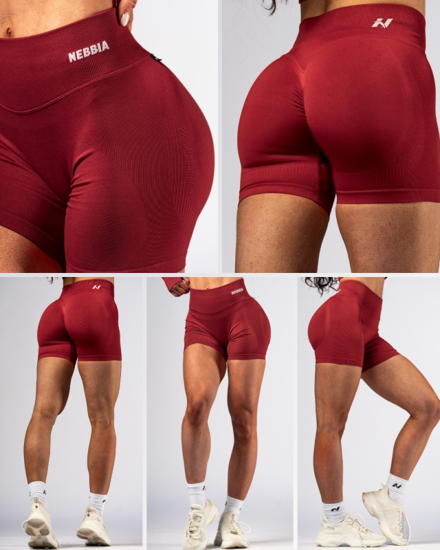 Tieto dámske NEBBIA šortky s vysokým pásom v bordovo-červenej farbe sú pre ženy, ktoré sa neboja vyniknúť! NEBBIA dámske šortky s vysokým pásom v hlbokom bordovom odtieni spájajú odvahu s eleganciou – nie sú tak kričavé ako jasná červená, ale stále ťa odlíšia od davu a dodajú tvojmu outfitu luxusný, sebavedomý nádych. Bezšvové spracovanie eliminuje akékoľvek otlačenie a umožňuje ti plne sa sústrediť na svoj výkon. Ikonický push-up efekt zvýrazní tvoje glutes a dodá ti sebavedomie, ktoré si zaslúžiš. V-shape high-waist pás vytvaruje siluetu a kompresný fit drží na mieste. NEBBIA dámske šortky s vysokým pásom – pre ženy so zmyslom pre detail!