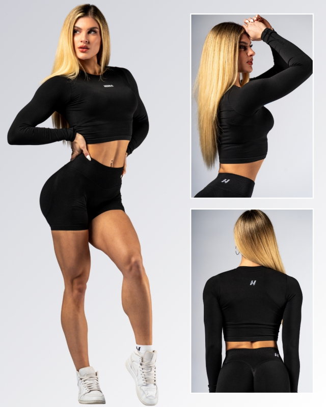 Čierny bezšvový crop top s dlhým rukávom od značky NEBBIA