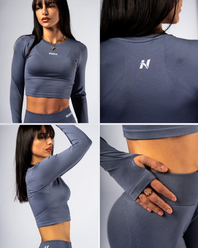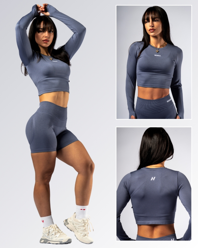 Bezšvový crop top od značky NEBBIA s dlhým rukávom v sivo-modrej farbe